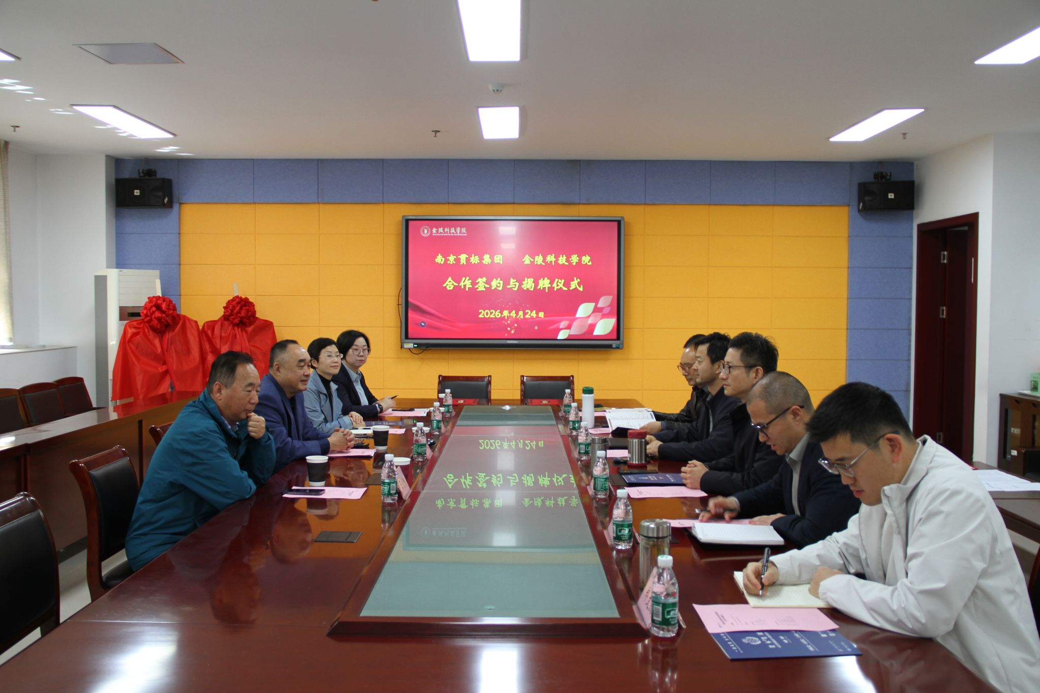 为深化产教融合、促进校企协同育人,4月24日上午,商学院与南京贯标集团合作框架协议签约暨揭牌仪式在科技楼3号楼409会议室举行。南京贯标集团董事长陈健,副总经理金海容、规划发展委主任王欣荣、办公室主任张娟,商学院全体班子成员及相关负责人参加活动。会议由商学院副院长黄阳主持。