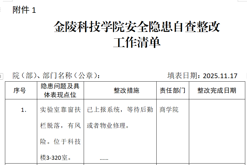 商学院在全院开展2025年度消防安全专项检查,对所有实验室、办公室、图书室、施工工地等消防重点场所部位火灾隐患风险点和薄弱环节展开全面隐患排查。11月17日,商学院实验中心组织本部门对所辖15间实验室进行了消防设施、器材的专项检查,院办对商学院所有办公室、会议室、图书室、资料室进行消防安全检查,除了一处栏杆脱落外,未发现其他消防安全隐患。《安全隐患自查整改工作清单》已及时上报至保卫处。
