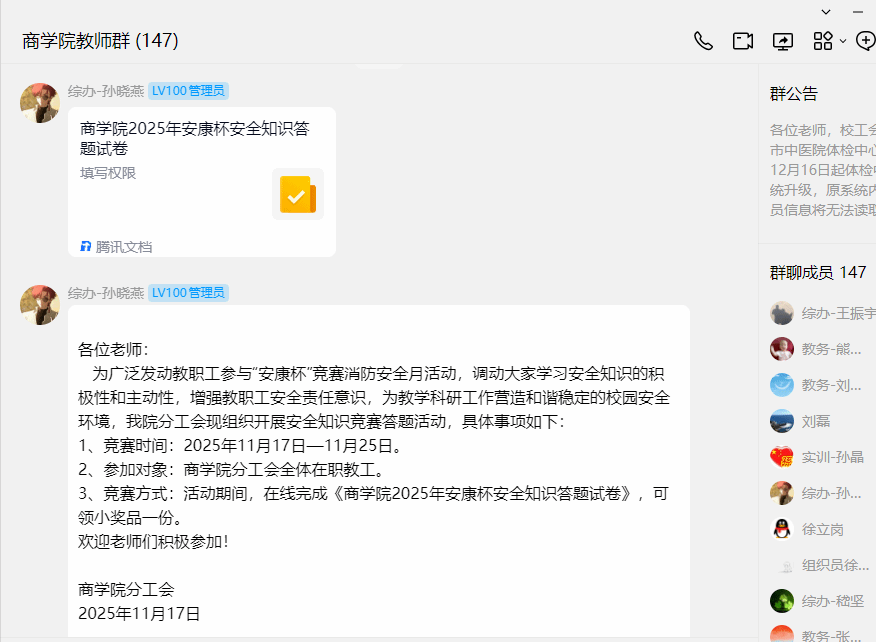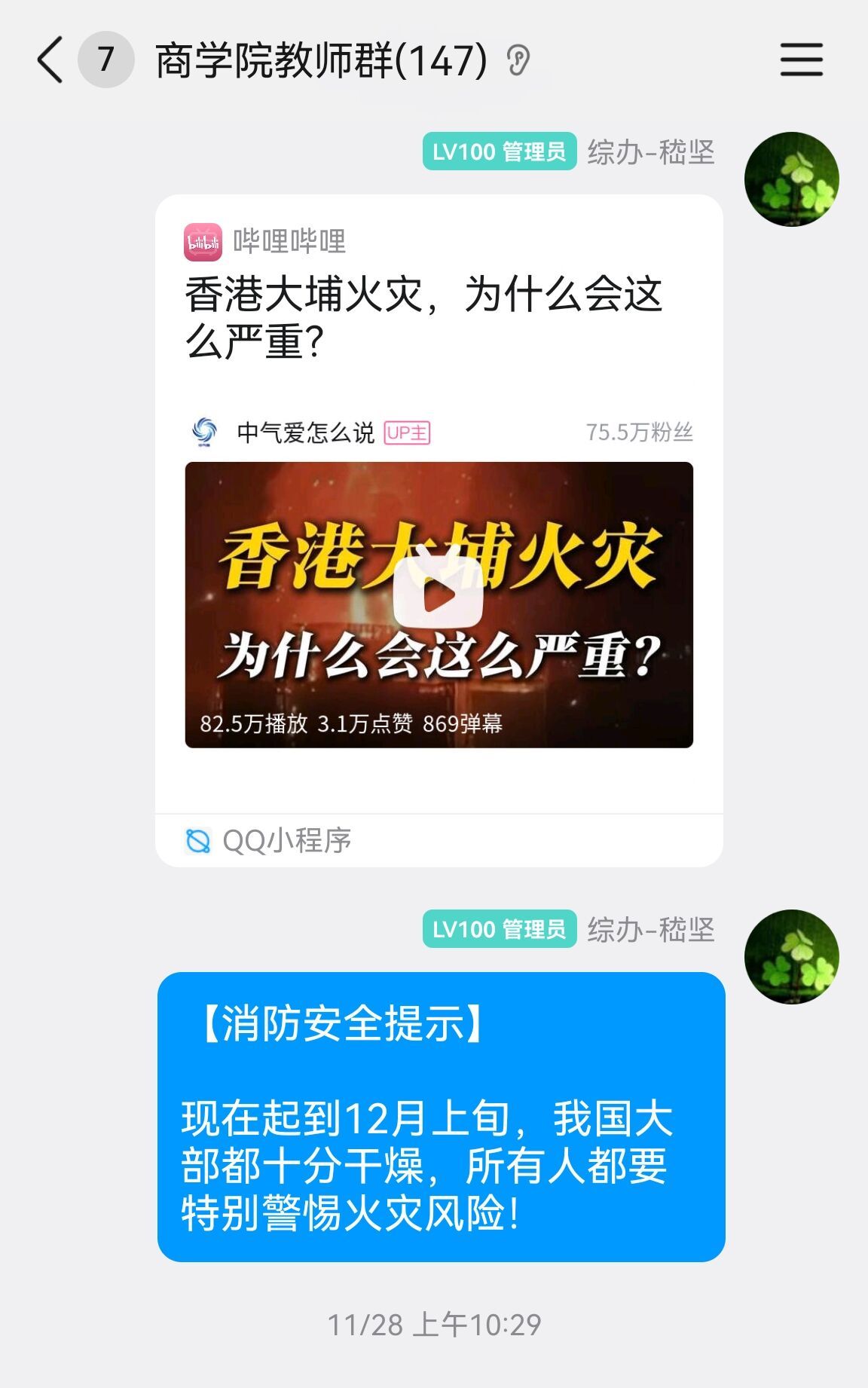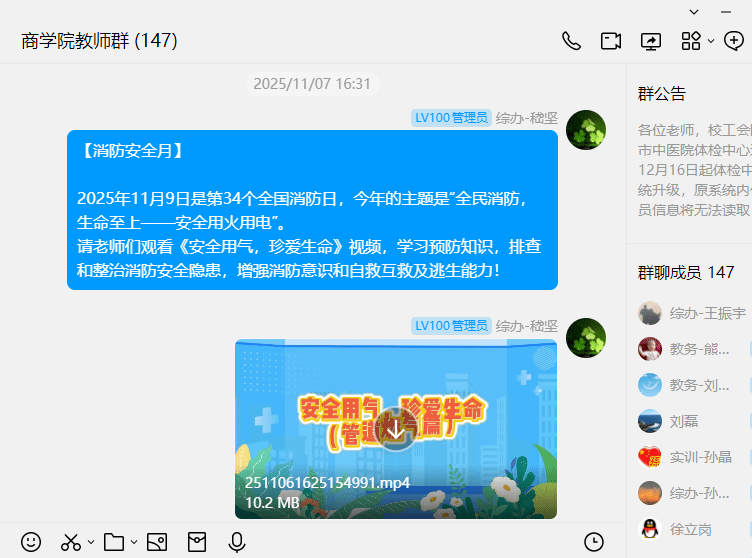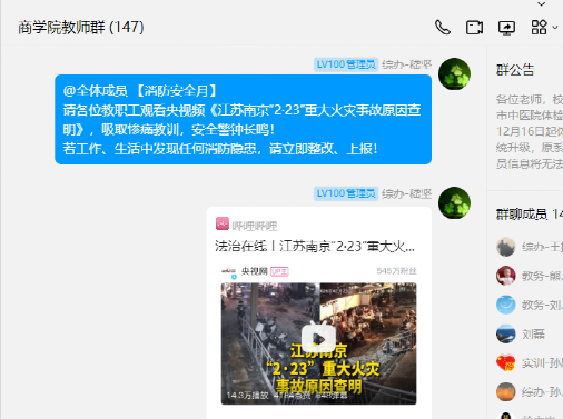 院办安全联络员积极转发学校相关通知和消防安全方面的知识,要求老师们提高消防安全意识;通过学院微信群、QQ群要求教职工观看消防安全相关警示教育片,并在商学院的公共大屏幕上循环播放央视频的消防安全公开课。