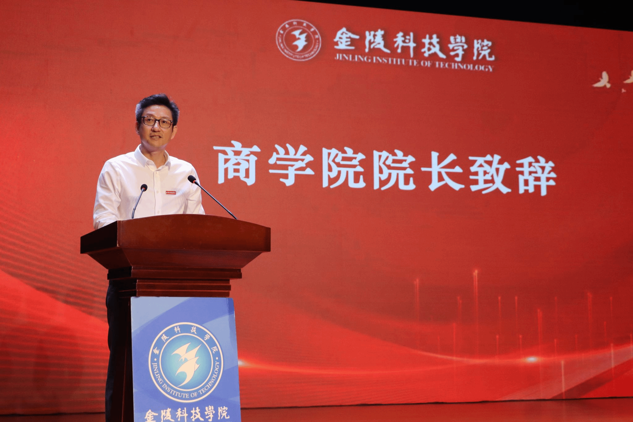 在庄重的介绍环节后,商学院院长刘磊发表致辞。他详细介绍了商学院的学科布局、专业优势、师资力量、国际合作与教学资源,并围绕“厚德兴业”的校训,向新生提出希望。