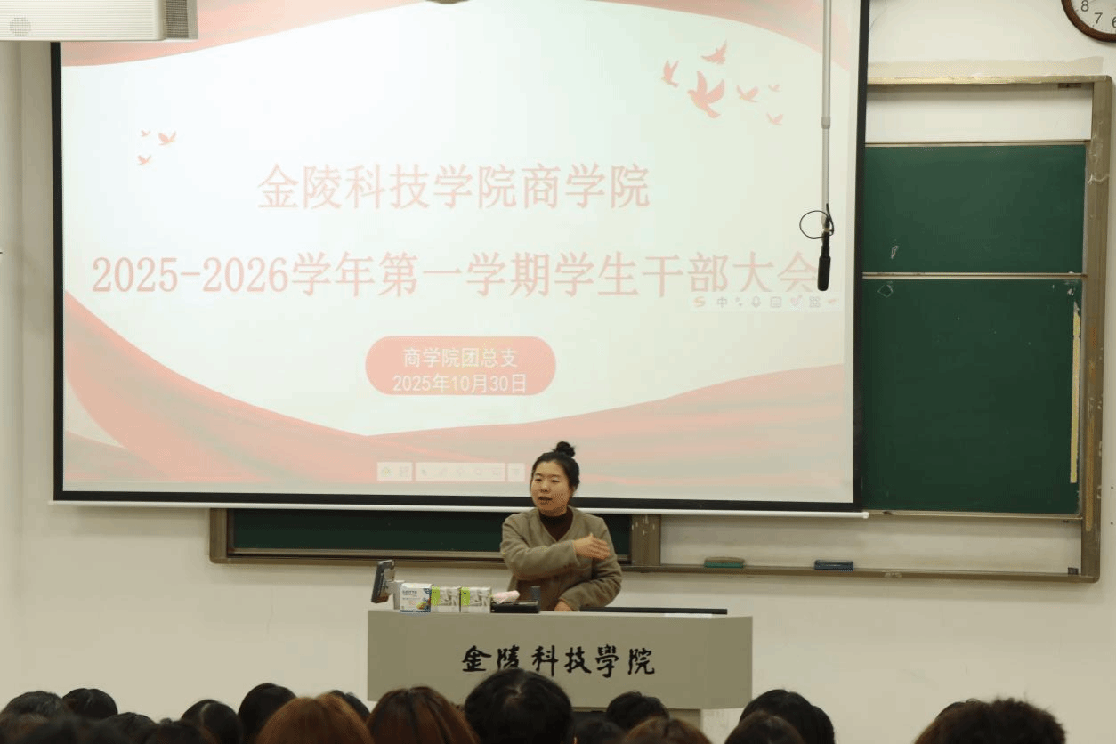 2025年10月30日晚,金陵科技学院商学院2025级新生学生干部启航大会在教学楼8300教室顺利召开。本次大会由商学院团总支书记徐冰洁老师主持,旨在帮助新任学生干部明确角色定位、熟悉工作职责,快速融入学院学生工作体系。商学院团总支、学生会主要干部及2025级全体新生班委参加了会议。